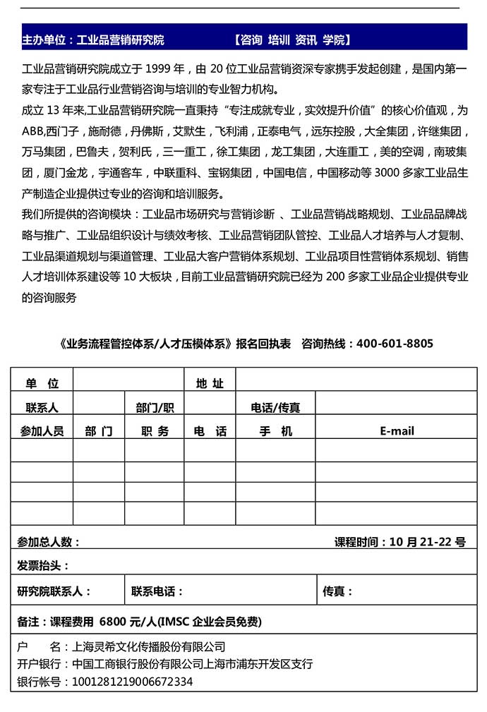 | 上一條:【往期公開課】10月14-15號深度接觸的十三刀/4P營銷策略/高層公關(guān)的七劍下天山 | 返回 |