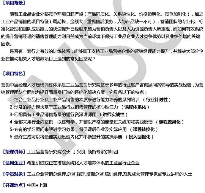 快速批量復(fù)制優(yōu)秀的工業(yè)品營(yíng)銷(xiāo)中層骨干,系統(tǒng)打造專(zhuān)業(yè)的工業(yè)品營(yíng)銷(xiāo)管理團(tuán)隊(duì)