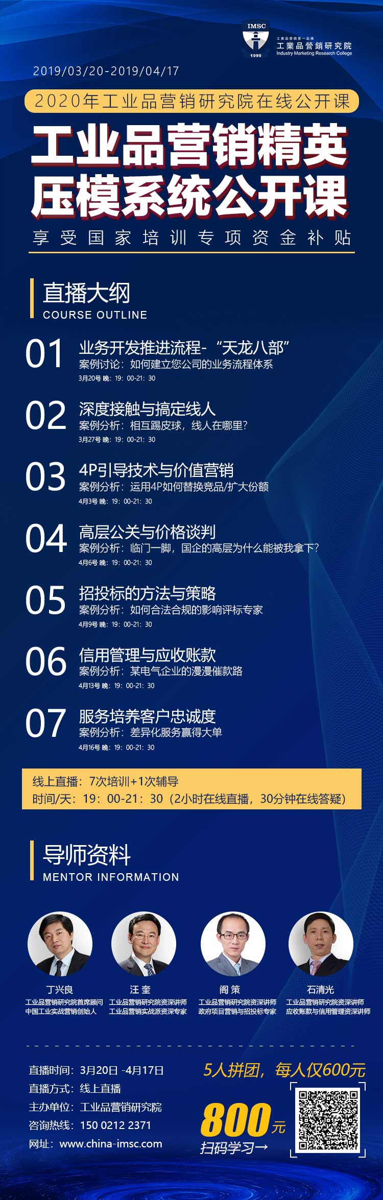 3月20日—4月17日,在線直播:工業(yè)品營銷精英壓模系統(tǒng)公開課(20個小時,適合中基層,線下公開課原價(jià)9000元/人),7次直播課程,2:30小時/次+1次2小時深度輔導(dǎo)!
