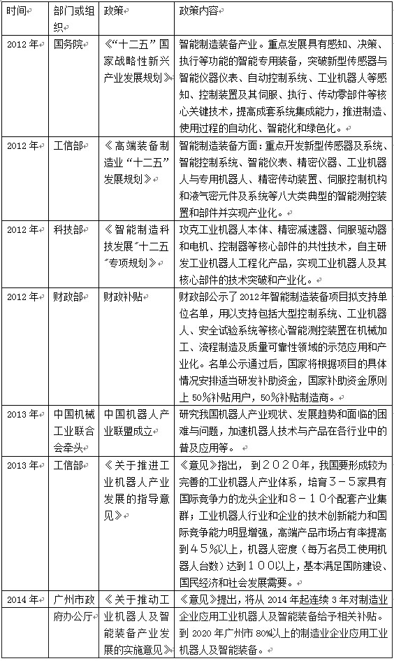 近年來智能制造及機器人產(chǎn)業(yè)發(fā)展支持政策 專家認為,機器人產(chǎn)業(yè)盛宴已經(jīng)到來,2014年中國將成為全球最大的機器人市場。但事實上,工業(yè)機器人浪潮來得比我們想象中更兇猛。數(shù)據(jù)顯示,2013年中國就已經(jīng)超過日本,成為全球最大的工業(yè)機器人買家,全球每售出的5臺工業(yè)機器人中有1臺就被中國買走。