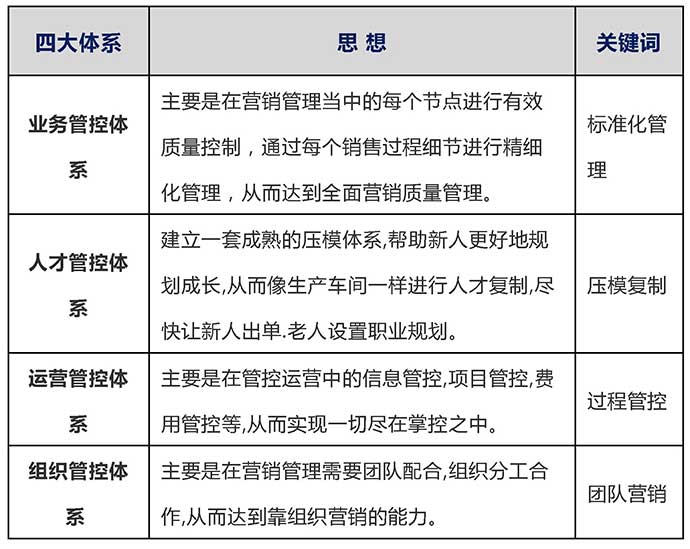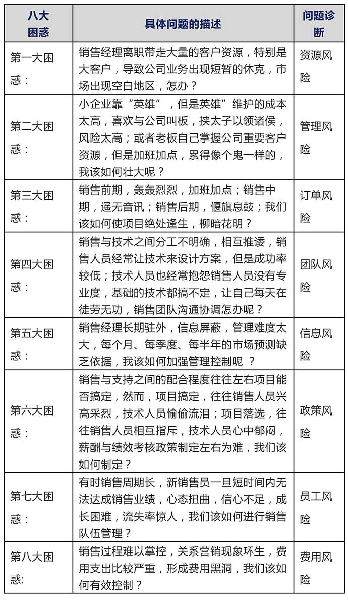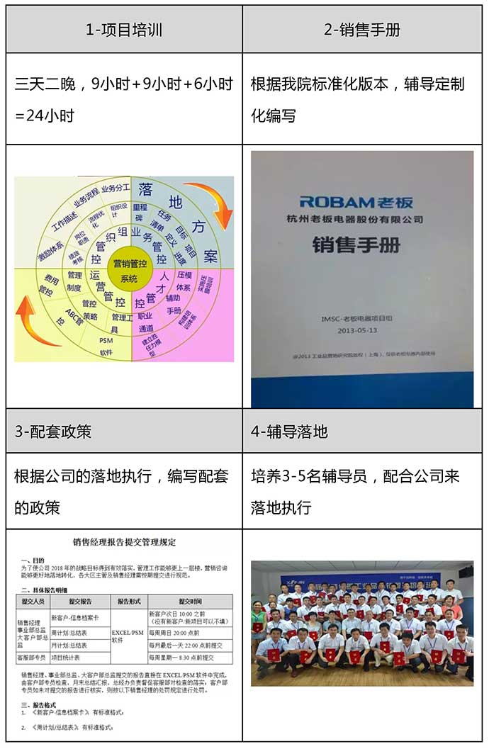 一、營銷管控系統(tǒng)解決八大問題![]() 二、工業(yè)品營銷管控系統(tǒng)的核心模塊 ![]() 三、培訓(xùn)+手冊+政策+輔導(dǎo)—訓(xùn)練大綱 ![]() 四、保障項(xiàng)目落地的四大輔導(dǎo)方式 ![]() 五、【培訓(xùn)+手冊+政策+輔導(dǎo)】的輔導(dǎo)大綱 前言:工業(yè)企業(yè)營銷管理中面臨的八大挑戰(zhàn) 培訓(xùn)內(nèi)容: 工業(yè)企業(yè)的大腦:資源風(fēng)險 工業(yè)企業(yè)的五官:管理風(fēng)險 工業(yè)企業(yè)的心臟:訂單風(fēng)險 工業(yè)企業(yè)的骨架:團(tuán)隊(duì)風(fēng)險 工業(yè)企業(yè)的腸胃:信息風(fēng)險 工業(yè)企業(yè)的皮膚:政策風(fēng)險 工業(yè)企業(yè)的雙手:員工風(fēng)險 工業(yè)企業(yè)的雙腳:費(fèi)用風(fēng)險 編寫內(nèi)容:整理出自己企業(yè)營銷管控的常見困惑 輔導(dǎo)內(nèi)容:明確問題出現(xiàn)的具體原因并分析 成果展示:定制自己企業(yè)問題及解決方案 第一部分 營銷管控系統(tǒng)之一:業(yè)務(wù)管控,建立標(biāo)準(zhǔn)化體系 培訓(xùn)內(nèi)容:業(yè)務(wù)流程管控體系---天龍八部 第一步:信息收集 第二部:深度接觸 第三部:方案設(shè)計 第四部:技術(shù)交流 第五部:方案確認(rèn) 第六部:高層公關(guān) 第七部:商務(wù)談判 第八部:簽約成交 課程工具:“業(yè)務(wù)流程標(biāo)準(zhǔn)化”清單 編寫內(nèi)容:整理出自己企業(yè)的業(yè)務(wù)管控體系 輔導(dǎo)內(nèi)容:運(yùn)用業(yè)務(wù)管控的七步分析法 成果展示:形成一套公司《業(yè)務(wù)管控體系》 業(yè)務(wù)管控體系的五個模塊 四大體系思想 1、里程碑 從潛在用戶發(fā)展到成交用戶的業(yè)務(wù)推進(jìn)過程,進(jìn)行歸納總結(jié)為幾個階段; 2、項(xiàng)目進(jìn)度 從潛在用戶發(fā)展到成交用戶,業(yè)務(wù)推進(jìn)的可能進(jìn)度,反應(yīng)出項(xiàng)目的進(jìn)展情況或者可能的概率; 3、階段定義 針對每一個階段必須有一個界定的標(biāo)準(zhǔn),用一句話來描述本里程碑產(chǎn)生的過程; 4、成功標(biāo)準(zhǔn) 針對階段定義達(dá)成的最后后果,有一個明確的結(jié)果,用一句話進(jìn)行概括; 5、工作任務(wù)清單 從潛在用戶發(fā)展到成交用戶,每一個階段必須完成的任務(wù)包,這個任務(wù)包必須以小的結(jié)果為導(dǎo)向。 第二部分 營銷管控系統(tǒng)之二:人才管控 培訓(xùn)內(nèi)容:編制銷售手冊的內(nèi)容 天龍一部:信息收集 天龍二部:深度接觸 天龍三部:方案設(shè)計 天龍四部:技術(shù)交流 天龍五部:方案確認(rèn) 天龍六部:高層公關(guān) 天龍七部:商務(wù)談判 天龍八部:簽約合同 每一個里程碑--目的--原則-方法--標(biāo)準(zhǔn) 編寫內(nèi)容:形成一套自己公司的銷售手冊 輔導(dǎo)內(nèi)容:運(yùn)用銷售手冊進(jìn)行有效培訓(xùn)與輔導(dǎo) 成果展示:形成一套公司《銷售手冊》 第三部分 營銷管控系統(tǒng)之三:運(yùn)營管控 一:信息收集是落地執(zhí)行的第一步 1)信息收集問題分析 如何應(yīng)對銷售人員抗拒信息填寫 如何提高銷售人員的信息填寫質(zhì)量 如何利用政策來促進(jìn)信息收集的可能性 案例分享:唐山盾石電氣的PSM軟件為什么效果好? 2)立項(xiàng)評估問題分析 如何提高銷售人員項(xiàng)目報備質(zhì)量 如何讓項(xiàng)目評估要素與實(shí)際項(xiàng)目評估目標(biāo)相匹配 如何利用項(xiàng)目立項(xiàng)標(biāo)準(zhǔn)進(jìn)行人員匹配 特殊項(xiàng)目如何進(jìn)行立項(xiàng)評估 案例分享:綠奧鍋爐如何利用立項(xiàng)評估,讓銷售成功率一年提升118% 3)信息分析與管理 信息處理與分析 信息對管理者的價值 信息分析報告的格式 信息分析與銷售問題的掛鉤 案例分享:新疆藍(lán)山屯河,讓信息管理更加高效的秘訣 二:項(xiàng)目進(jìn)度與過程管控—七步分析法 1)明確規(guī)范化的業(yè)務(wù)流程體系 明確公司的業(yè)務(wù)模式(OEM配套、大客戶、項(xiàng)目、ODM) 2)明確業(yè)務(wù)流程體系的里程碑 針對具體的業(yè)務(wù)流程體系進(jìn)行分解為里程碑 3)明確里程碑的工作任務(wù)清單 把每一個里程碑分解為3—7個工作任務(wù)清單 4)完成工作任務(wù)清單的日?;顒?/span> 針對每一個工作任務(wù)清單,進(jìn)行歸納總結(jié):所有的日?;顒?/span> 5)每一個日?;顒颖仨氝_(dá)成目的 根據(jù)日常活動,進(jìn)行一一對應(yīng),確保拜訪或電話的目的 6)達(dá)成目的,需要的具體策略方法 為了達(dá)成目的,在做具體的日常活動之中,我有什么具體策略 7)完成策略方法,需要的常用話術(shù) 案例分享:人本軸承利用“七步分析法”,進(jìn)行團(tuán)隊(duì)營銷 三:銷售漏斗與銷售預(yù)測 1)銷售漏斗分析 銷售漏斗的作用和意義 銷售漏斗分析應(yīng)用 提高銷售漏斗分析的前提條件 銷售漏斗分析的模型 案例分享:南京天南京天溯自動化 建立自我的“銷售漏斗模型” 2)銷售預(yù)測與規(guī)劃分析 銷售預(yù)測的好處與意義 與銷售預(yù)測相關(guān)的關(guān)鍵信息 銷售預(yù)測的模式和方法 如何應(yīng)用銷售預(yù)測改善工作規(guī)劃 案例分享:福建南安協(xié)進(jìn)的精細(xì)化管理--"銷售預(yù)測機(jī)制“ 編寫內(nèi)容:形成一套內(nèi)部管控的表單工具 輔導(dǎo)內(nèi)容:如何運(yùn)用表單工具進(jìn)行日常管理 成果展示:形成一套公