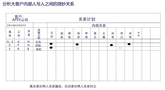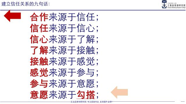 用通俗語言提煉了“同流不合污的五句經(jīng)典---不能同流怎能交流、不能交流怎能交心、不能交心怎能交易、不能交易怎能交錢、不能交錢怎能交貨”、“建立信任感的九句話--合作來源于信任;信任來源于信心;信心來源于了解;了解來源于接觸;接觸來源于感覺;感覺來源于參與;參與來源于意愿;意愿來源于勾搭”、“大客戶內(nèi)部關(guān)系搞定的三句經(jīng)典—消滅反對者、拉攏中立者、擴大支持者”等;更為了協(xié)助學員更好地落地提出了—大客戶攻關(guān)的五個工具、大客戶降價的二個關(guān)鍵工具、分析教練(結(jié)果導向型線人)的判斷工具等。
