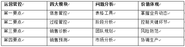 運營管控主要是指在營銷過程當(dāng)中對銷售信息的管控、項目的管控及費用的管控等,從而實現(xiàn)一切盡在掌控之中。運營管控的實質(zhì),是資源的管控, 即對企業(yè)擁有的資源進行充分的有效調(diào)解。運營管控表如圖2所示。