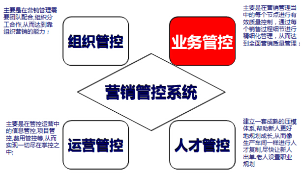 營銷業(yè)務(wù)管控分為四大體系,分別是組織管控、運營管控、人才管控、業(yè)務(wù)管控,四大體系結(jié)合起來,能夠更好的幫助企業(yè)解決營銷問題,實現(xiàn)業(yè)績目標(biāo)。營銷業(yè)務(wù)管控圖如圖5所示。