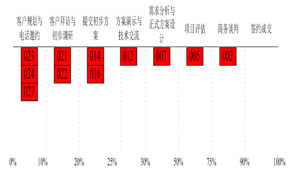下面的階段成功率圖顯示了編號(hào)為001的銷售項(xiàng)目目前所處的銷售階段。銷售經(jīng)理無須再先了解客戶目前正在做什么,銷售人員的工作已經(jīng)進(jìn)行到哪一步,才能夠判斷出銷售項(xiàng)目的大致情況,PSM項(xiàng)目型銷售成交管控系統(tǒng)可以直接告訴銷售經(jīng)理。另一方面,這個(gè)銷售項(xiàng)目的情況在銷售經(jīng)理的腦海中不再只是一個(gè)模糊的概念,而是一個(gè)具體的進(jìn)度。銷售經(jīng)理不僅僅知道001號(hào)銷售項(xiàng)目目前處在客戶拜訪與初步調(diào)研階段,而且知道該項(xiàng)目銷售的成功率在10%到20%之間。