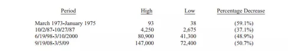 伯克希爾本身的歷史里就有一些生動(dòng)的例子,說明短期價(jià)格隨機(jī)性如何掩蓋長(zhǎng)期價(jià)值增長(zhǎng)。在過去的53年里,公司通過對(duì)收益進(jìn)行再投資并讓復(fù)利發(fā)揮魔力。年復(fù)一年,我們前進(jìn)著。然而伯克希爾股價(jià)則遭遇了四次重大的下跌。以下是殘酷的細(xì)節(jié):
