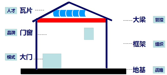 所以,我們把地基比喻為戰(zhàn)略、屋頂框架為組織、大梁為管控、瓦片為人才復制、門窗為品牌推廣、大門為渠道銷售模式。這就是許多的老板經(jīng)常遇到:營銷戰(zhàn)略、組織發(fā)展、營銷管控、人才復制、品牌發(fā)展、銷售模式等六個核心的問題。