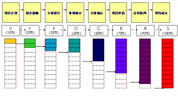 銷售過程需要分解成為幾個標(biāo)準(zhǔn)化的階段,例如:工業(yè)品項目銷售過程為:(如下)