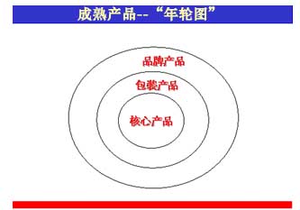 如圖,可以看到一個(gè)能夠提供給市場,并能滿足企業(yè)客戶使用需求的成熟產(chǎn)品的結(jié)構(gòu),它由三個(gè)層次組成,分別是核心產(chǎn)品、包裝產(chǎn)品及品牌產(chǎn)品,這就是我們所說的三個(gè)核心。核心產(chǎn)品位于內(nèi)部,包裝產(chǎn)品處于中間,品牌產(chǎn)品包括核心產(chǎn)品和包裝產(chǎn)品,最終形成一個(gè)年輪的圖像。