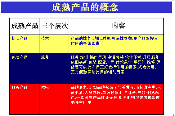 廣義的成熟產(chǎn)品是指向市場提供的、能滿足人們某種需要和利益的物質(zhì)產(chǎn)品及其非物質(zhì)形態(tài)的服務(wù)。物質(zhì)產(chǎn)品主要包括產(chǎn)品的實(shí)體及其品質(zhì)、特色﹙如色澤、味道、成分等﹚、式樣、品牌和包裝,它們能滿足顧客對(duì)使用價(jià)值的需要;非物質(zhì)形態(tài)的服務(wù)主要包括售后服務(wù)和保證、產(chǎn)品形象、銷售聲譽(yù)等,后者可以給顧客帶來利益和心理上的滿足和信任感,具有象征性價(jià)值,能滿足人們精神及心理上的需要。
