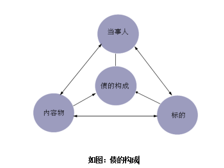 ①、當(dāng)事人:指?jìng)闹黝}即債的法律關(guān)系的當(dāng)事人,其中享有權(quán)利的一方為債權(quán)人,負(fù)有義務(wù)的一方為債務(wù)人,法律關(guān)系的雙方當(dāng)事人是特定的自然人或者法人,債權(quán)人債權(quán)的實(shí)現(xiàn)有賴(lài)于債務(wù)人的行為,兩者缺少一方則不構(gòu)成債。
