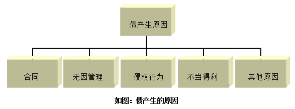 綜上所述,債是一種民事法律關(guān)系,其發(fā)生必須基于一定的法律事實(shí)。能夠引起債的關(guān)系發(fā)生的法律事實(shí)就是債的發(fā)生原因,在我國(guó)債的發(fā)生原因主要有以下幾類(lèi),如圖: