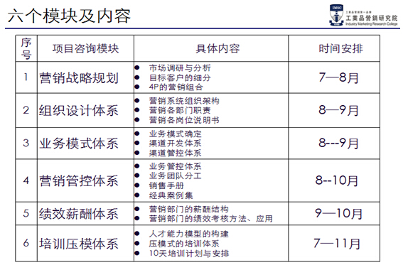 ?營銷戰(zhàn)略 產(chǎn)品研發(fā)與市場脫節(jié),沒有根據(jù)國家政策提前做出布局;公司的幾類產(chǎn)品缺乏有效的關(guān)聯(lián)度,缺乏系統(tǒng)化的戰(zhàn)略布局,幾個(gè)產(chǎn)品的業(yè)務(wù)方向太散,形不成合力等。 ?組織架構(gòu) 沒有建立起以市場為導(dǎo)向的價(jià)值鏈體系,各部門的配合協(xié)調(diào)不夠,現(xiàn)有組織以職能型為主,缺乏市場導(dǎo)向;市場部門脫離營銷中心,缺乏有銷售的有力支持等。 ?績效與薪酬 目標(biāo)制定更多的是由上而下,沒有結(jié)合一線和管理人員的設(shè)定;考核只有目標(biāo),不注重過程,缺乏激勵(lì),考核指標(biāo)不夠全面;營銷部門和生產(chǎn)部門都是獨(dú)立考核,缺乏協(xié)同效應(yīng)等。 ?業(yè)務(wù)模式 沒有統(tǒng)一的渠道規(guī)劃和定位,疆內(nèi)的銷售網(wǎng)絡(luò)相對單一;針對經(jīng)銷商缺乏有效的市場策略和管控等。 ?業(yè)務(wù)管控 業(yè)務(wù)員的日常信息缺乏有效的管控;大項(xiàng)目和大訂單動(dòng)態(tài)跟蹤缺乏,訂單丟失難以找出原因;大項(xiàng)目更多單邊作戰(zhàn),缺乏大客戶的公關(guān)管理體系。 ?培訓(xùn) 新人培訓(xùn)不夠、成長慢,不知道如何開發(fā)客戶;業(yè)務(wù)開發(fā)缺乏統(tǒng)一的話術(shù)和手冊,缺乏系統(tǒng)性的培訓(xùn)和成功案例的總結(jié);營銷觀念相對滯后。 工業(yè)品營銷研究院解決方案: